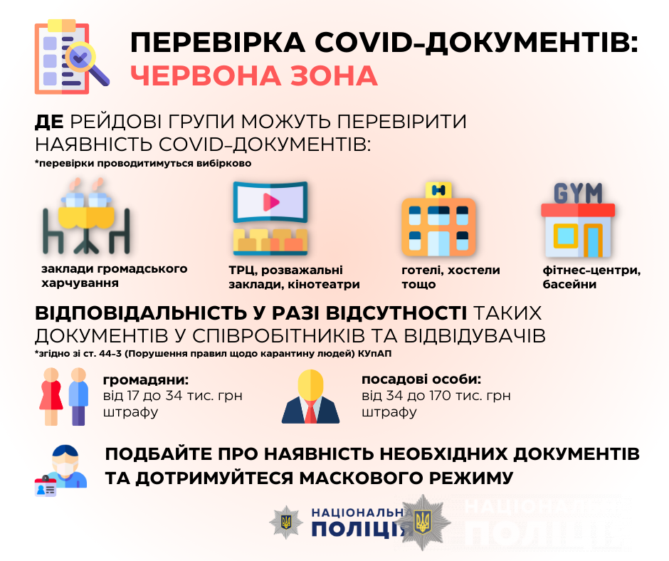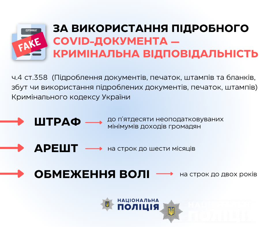 Для виявлення фактів підроблення або використання підробленої COVID-документації у Національній поліції створені та функціонують спеціальні мобільні групи. До їх складу входять як поліцейські, так і представники інших структур — санітарні лікарі, працівники Держпродспоживслужби, Укртрансбезпеки, муніципальної охорони тощо.