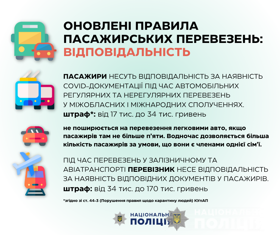 Нові правила стосуються як регулярних, так і нерегулярних перевезень пасажирів. Йдеться про автомобільний транспорт на автобусних маршрутах, авіаційний та залізничний транспорт міжобласного сполучення.