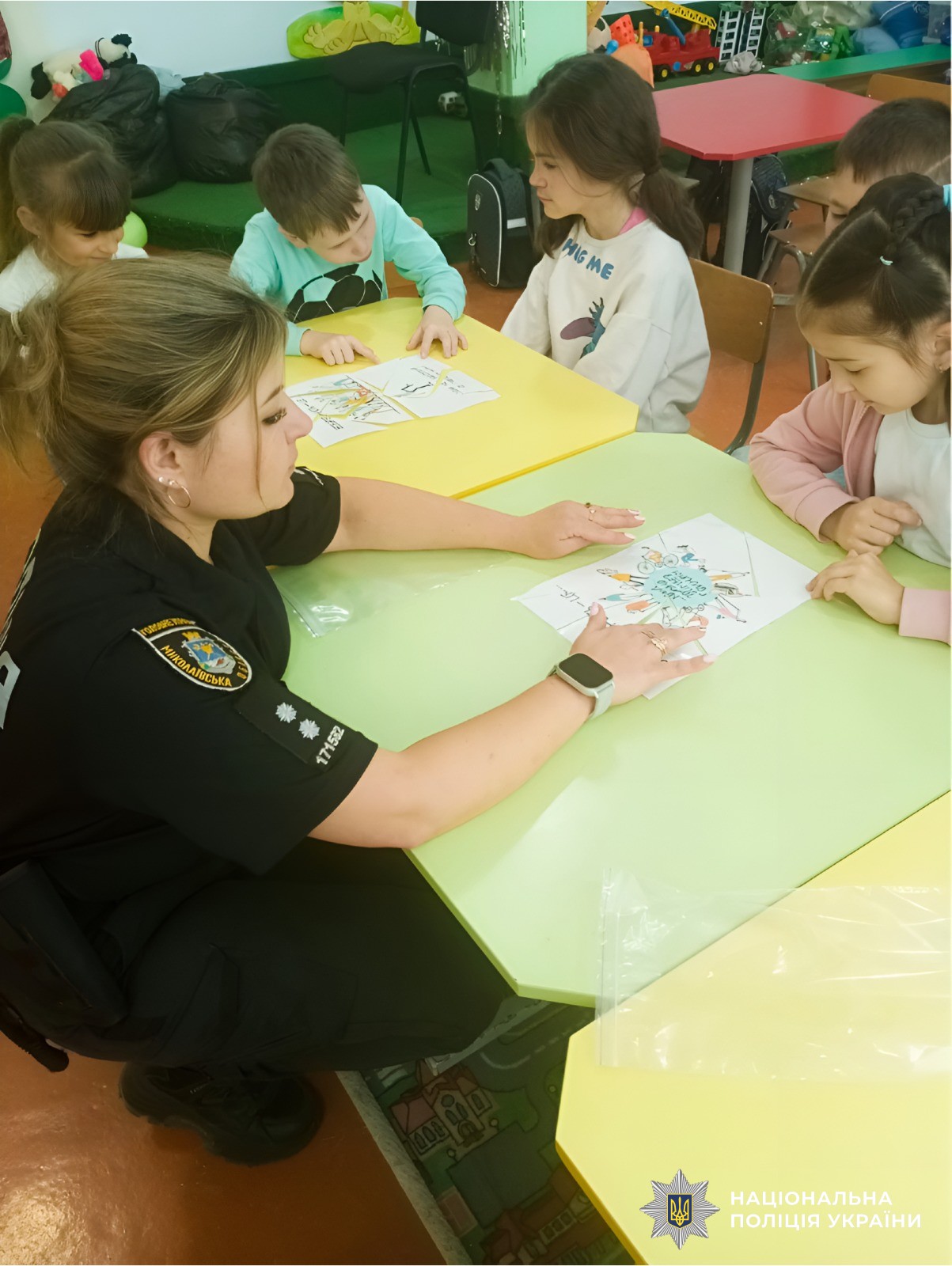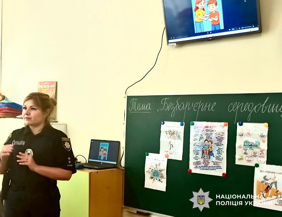 Офіцерка служби освітньої безпеки Вознесенського районного управління поліції Каріна Мельничук організувала пізнавальне заняття для учнів перших класів Вознесенського ліцею № 8.