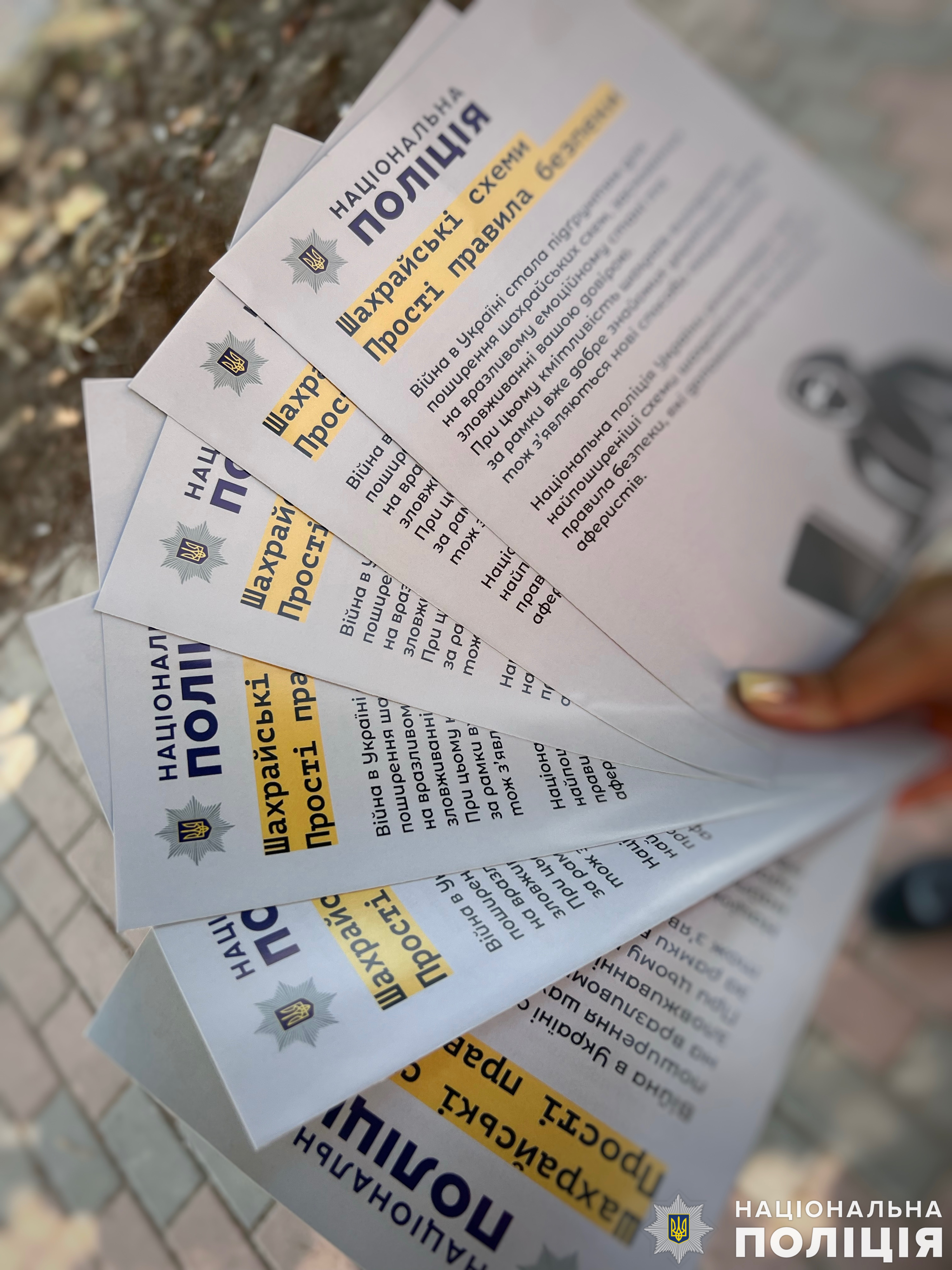 Спілкуючись із громадянами, правоохоронці роздавали їм інформаційні листівки, щоб місцеві мешканці ознайомились із викладеним у них алгоритмом дій протидії злочинам, до яких вдаються аферисти, та про те, як від них уберегтися.