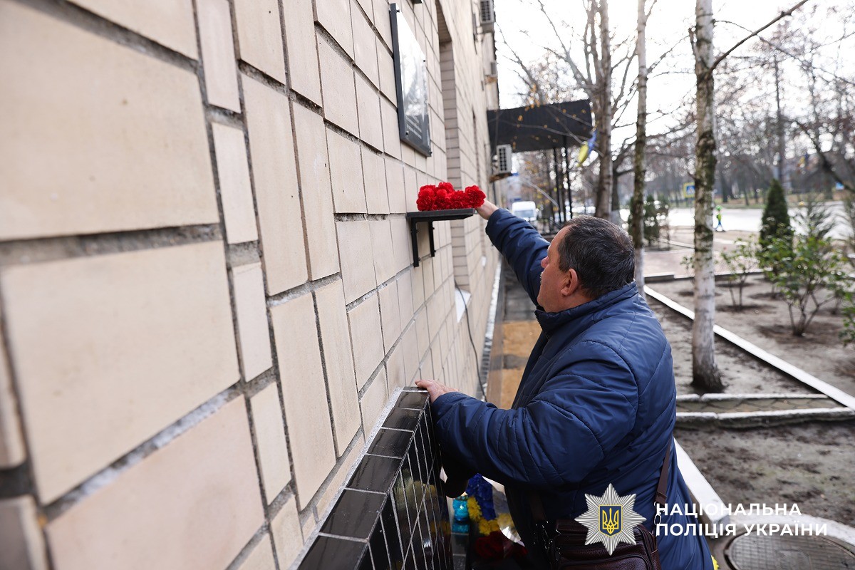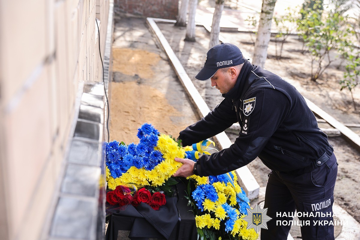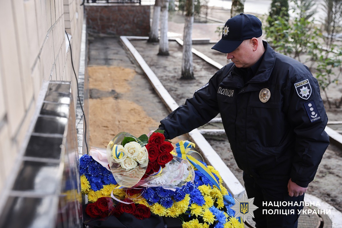 Правоохоронці вшанували пам'ять загиблого колеги та всіх полеглих за незалежність Героїв хвилиною мовчання та поклали квіти до меморіальної дошки.