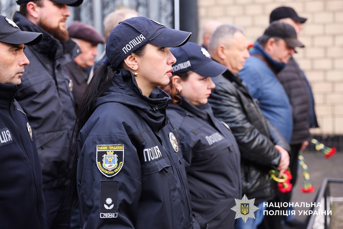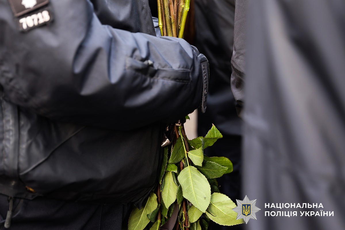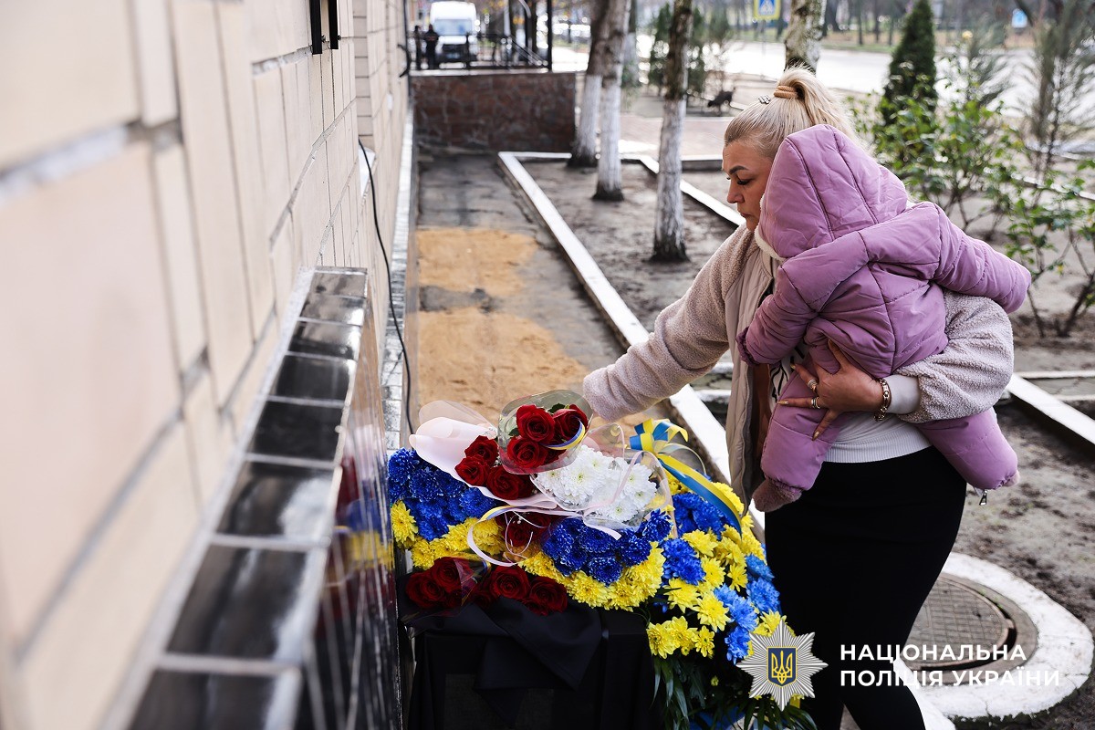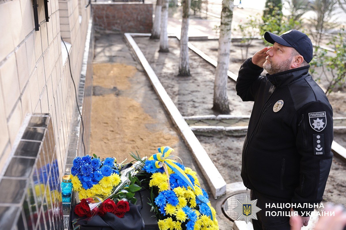 Правоохоронці вшанували пам'ять загиблого колеги та всіх полеглих за незалежність Героїв хвилиною мовчання та поклали квіти до меморіальної дошки.