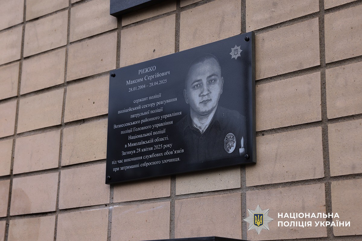 Меморіальну дошку в пам'ять про Максима Рижка встановили на фасаді будівлі Вознесенського районного управління поліції, де правоохоронець проходив службу. На церемонію відкриття зібралися рідні, близькі друзі, колеги та жителі громади, аби вшанувати світлу пам’ять правоохоронця.