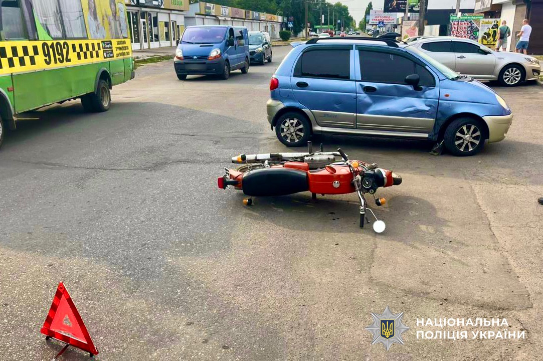 Сьогодні, 29 липня, близько 07:35 по вулиці Одеській у місті Первомайськ 41-річна водійка автомобілю Daewoo Matiz та 51-річний керманич мотоциклу Jawa ЧЗ-350 допустили зіткнення транспортних засобів. Внаслідок автопригоди водій двоколісного транспортну отримав тілесні ушкодження та медики його госпіталізувіали. Наразі поліцейські встановлюють усі обставини та причини автопригод.