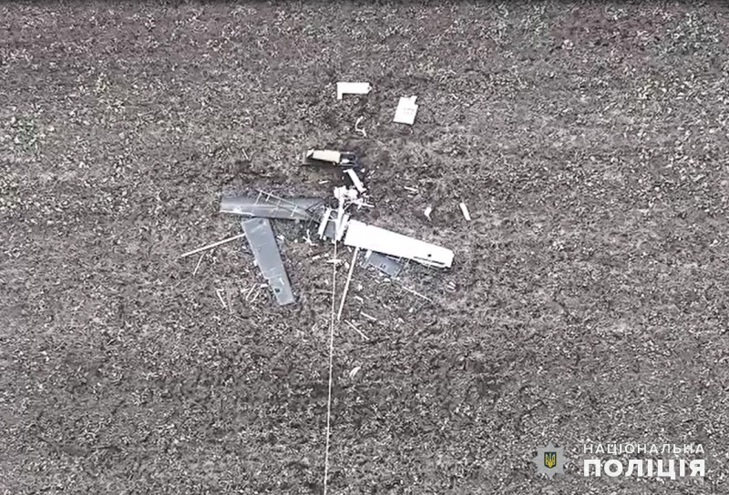 На місці падіння уламків дрону поліцейські вибухотехніки провели дистанційне знешкодження його бойової частини.