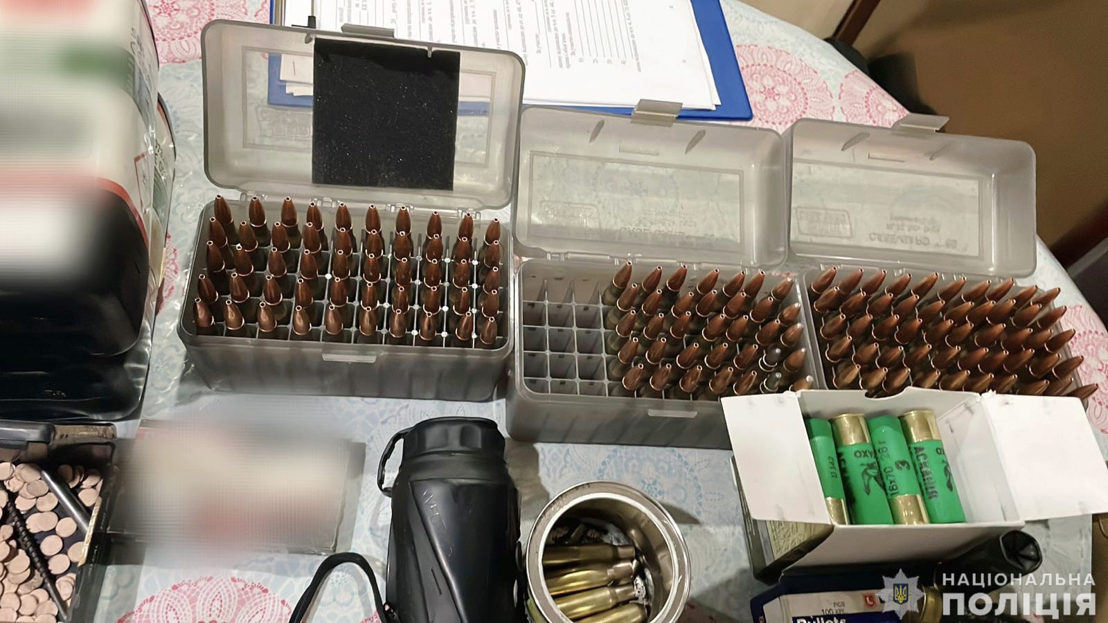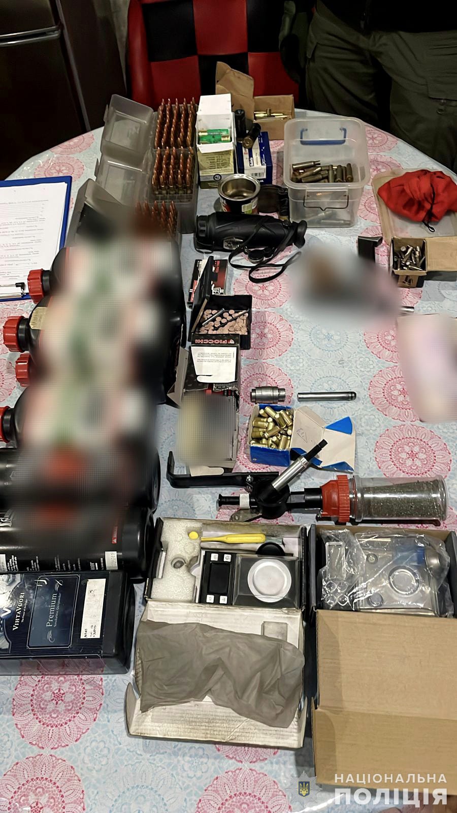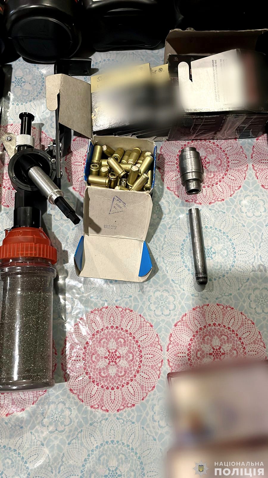 Під час санкціонованих обшуків за місцями мешкання фігурантів правоохоронці виявили та вилучили понад 1000 набоїв різного калібру, автомат системи Калашникова, гранату Ф-1, прес для завалювання гільз, а також капсулі, гільзи, кулі та порох для виготовлення патронів, станки для спорядження нарізних набоїв, електронні ваги для зважування пороху і мобільні телефони.