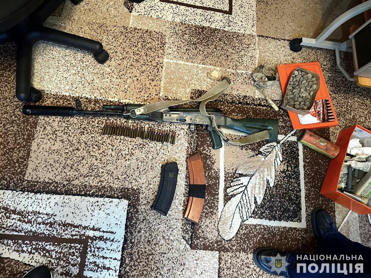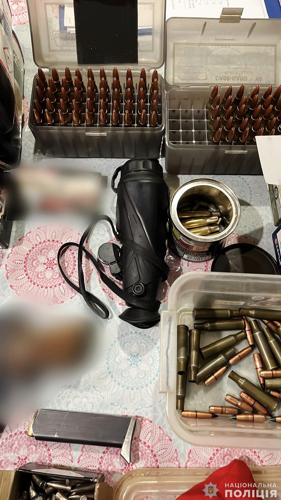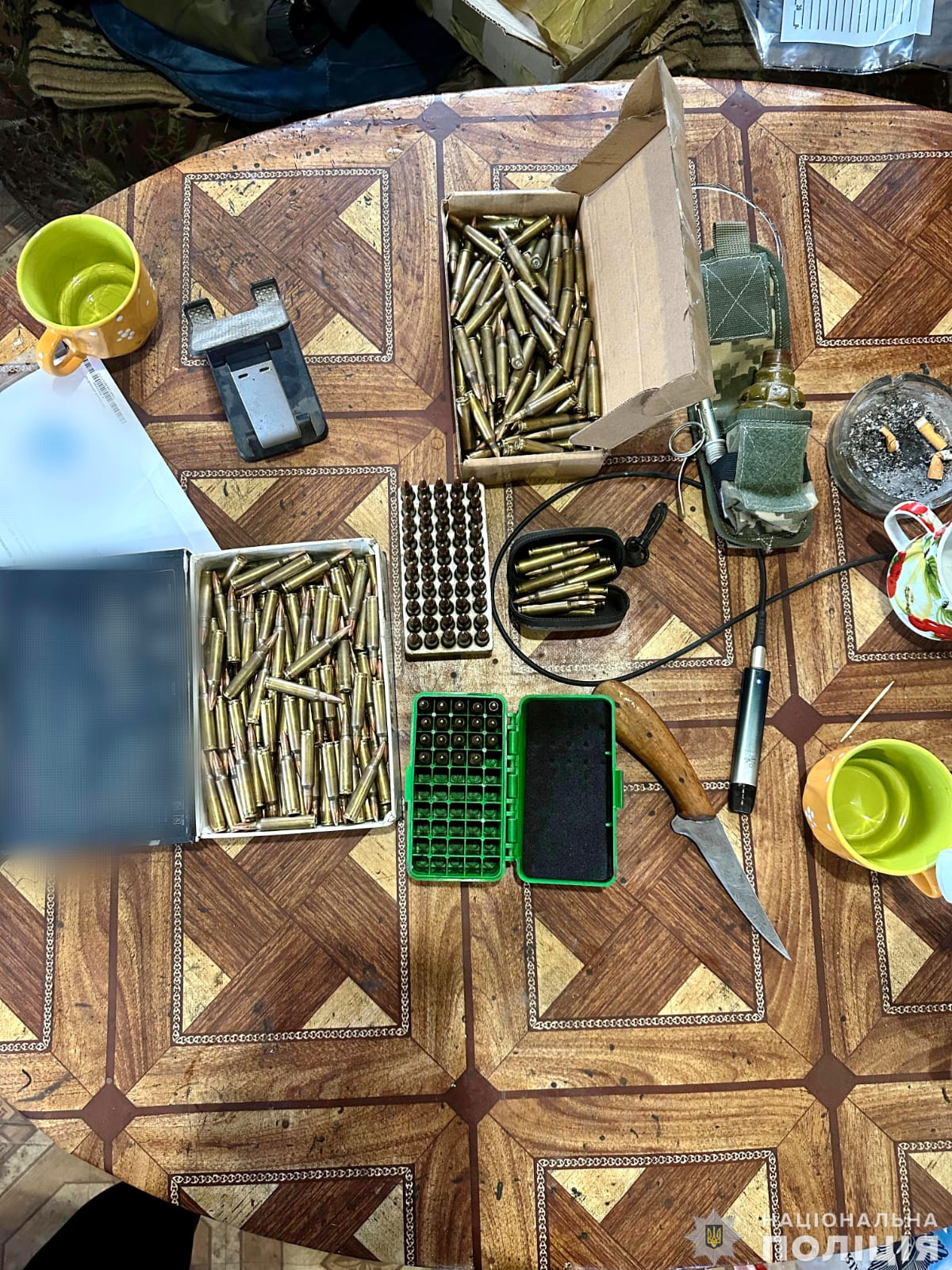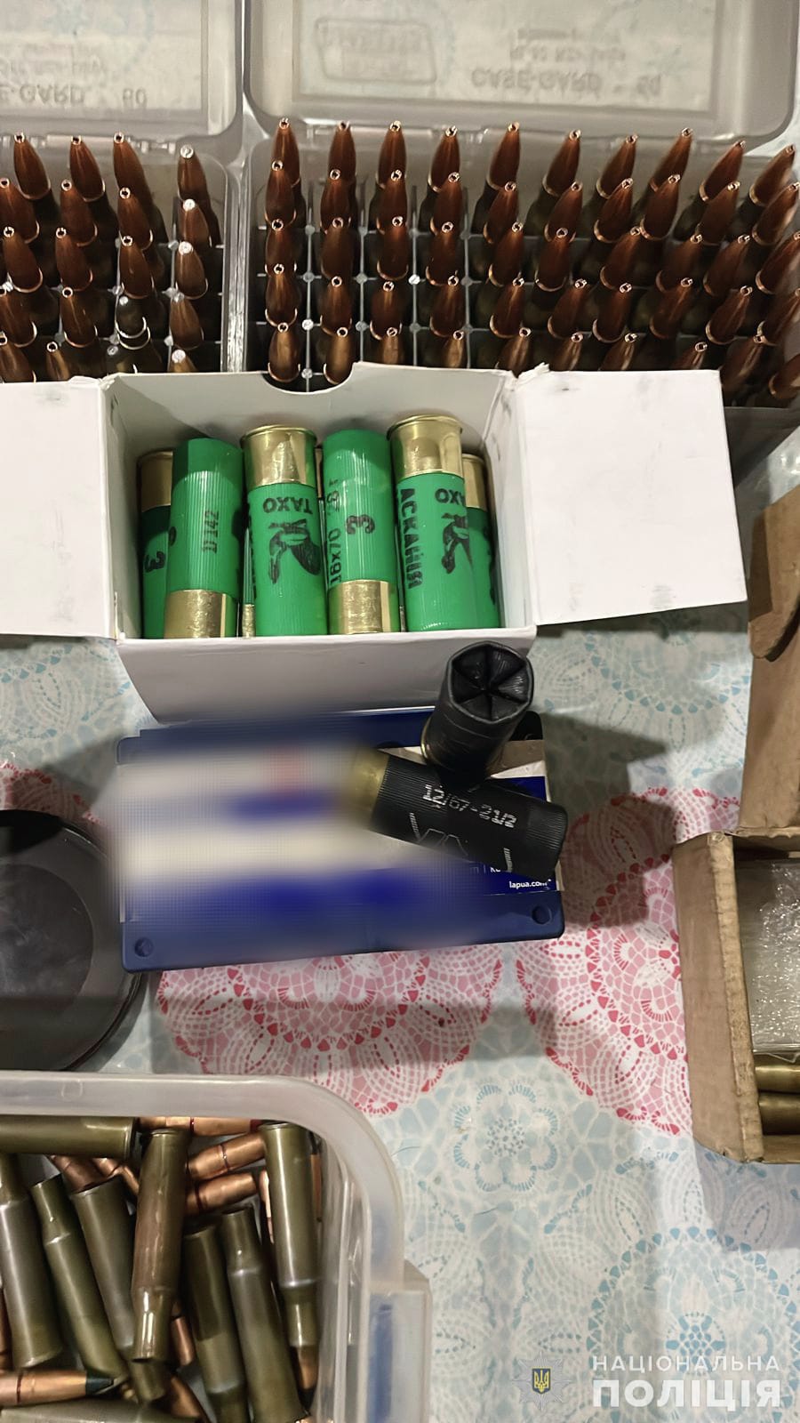 Під час санкціонованих обшуків за місцями мешкання фігурантів правоохоронці виявили та вилучили понад 1000 набоїв різного калібру, автомат системи Калашникова, гранату Ф-1, прес для завалювання гільз, а також капсулі, гільзи, кулі та порох для виготовлення патронів, станки для спорядження нарізних набоїв, електронні ваги для зважування пороху і мобільні телефони.