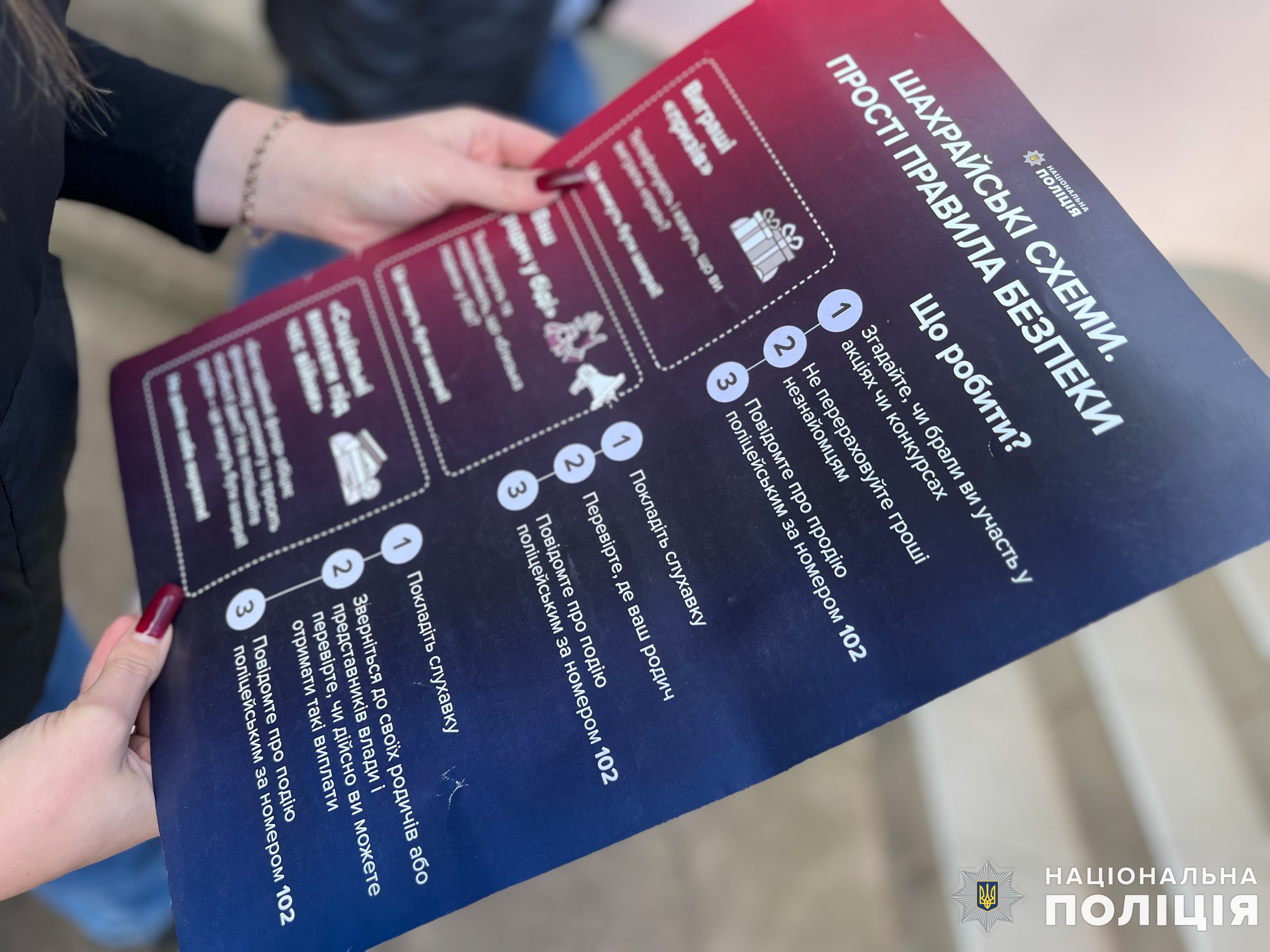 У громадських місцях, магазинах та організаціях правоохоронці розмістили плакати із загальними правилами протидії шахрайствам, щоб якомога більше людей дізнались про схеми, які використовують аферисти та як від них