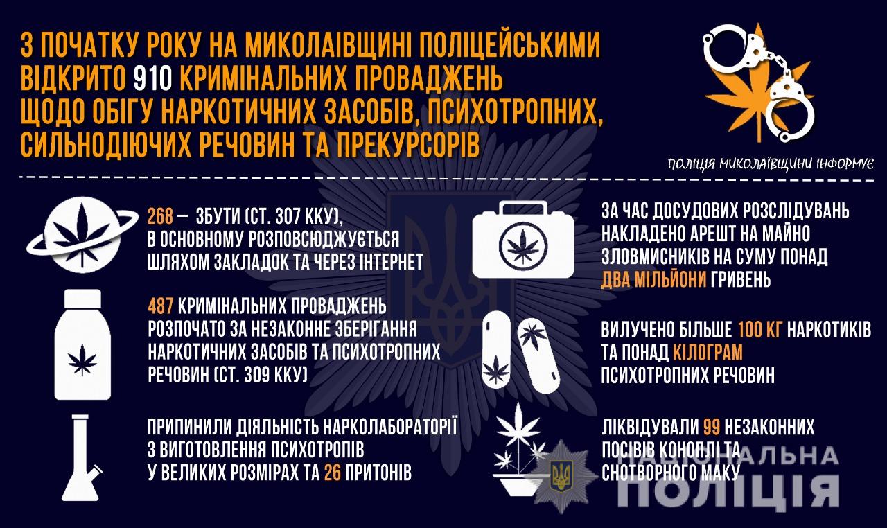 З початку року на території Миколаївської області було зареєстровано 910 кримінальних проваджень, пов'язаних з порушеннями встановленого порядку обігу наркотичних засобів, психотропних, сильнодіючих речовин та прекурсорів, серед яких 268 – це збути (ст. 307 ККУ). Підозру у збуті наркозасобів слідчі вручили 66 ділкам. Більшість таких злочинів наразі набули поширеного способу – безконтактного, шляхом закладок та через мережу інтернет. За злочини у сфері наркообігу 51 особу взято під варту, ще 27 – перебувають під домашнім арештом.