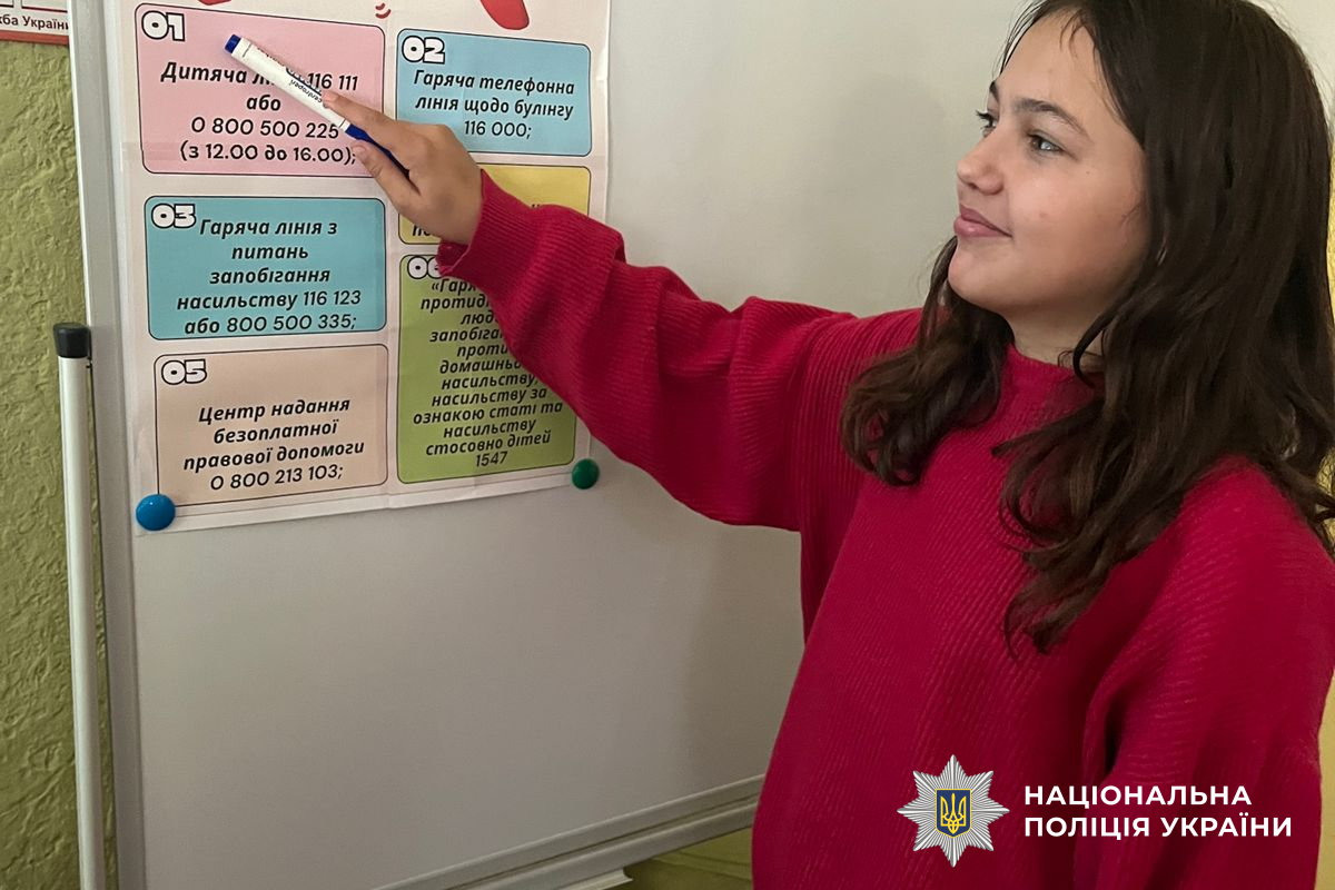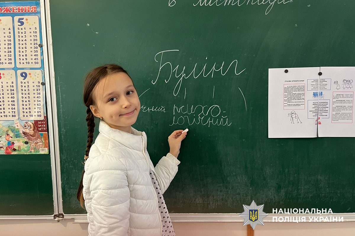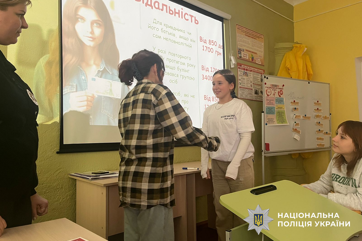 Для учнів 7-х класів офіцерка служби освітньої безпеки Вознесенського районного управління поліції Яна Ільчанінова провела заняття на тему «Без булінгу — у колі безпеки». Інспекторка нагадала підліткам що таке булінг та його види. Учасники заходу обговорили почуття агресора й жертви, а також визначали відмінність між булінгом і звичайним конфліктом.