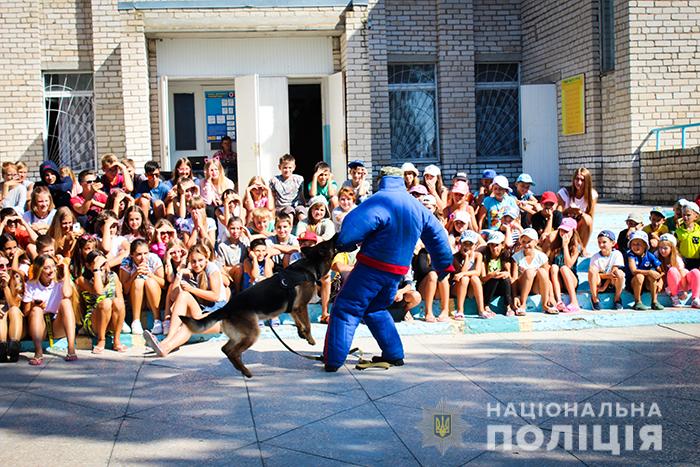Особливе враження справив на дітей виступ службового пса Барона, який затримував умовного злочинця та виконував усі команди з курсу дресирування.