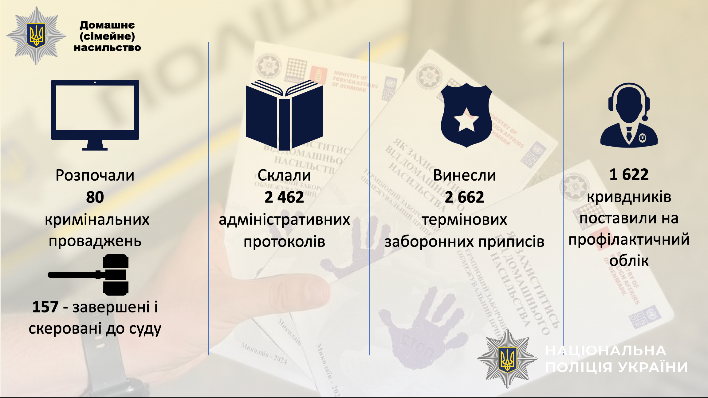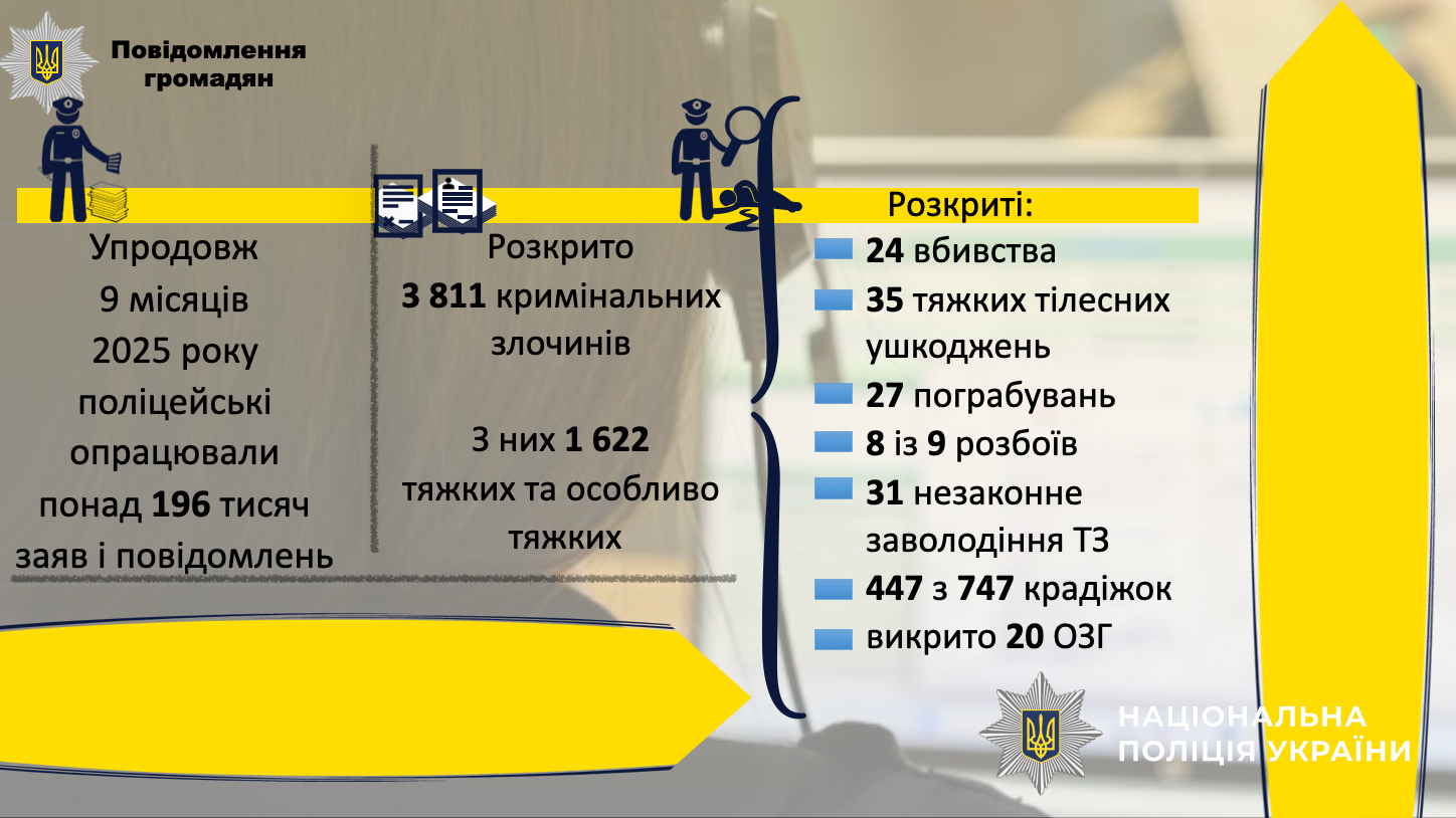 🔹За звітний період поліцейські опрацювали понад 196 тисяч заяв та повідомлень від громадян, з яких 62 010 з ознаками кримінальних правопорушень.