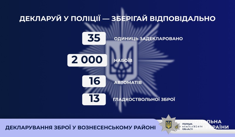 Від початку процесу декларування знайденої та здобутої громадянами вогнепальної зброї та боєприпасів, який триває з листопада минулого року, до сектору контролю за обігом зброї Вознесенського району звернулись 32 громадяни, які задекларували 35 одиниць зброї та до неї понад 2 000 набоїв, з них: 16 автоматів, 13 одиниць гладкоствольної зброї та 4 карабіни.