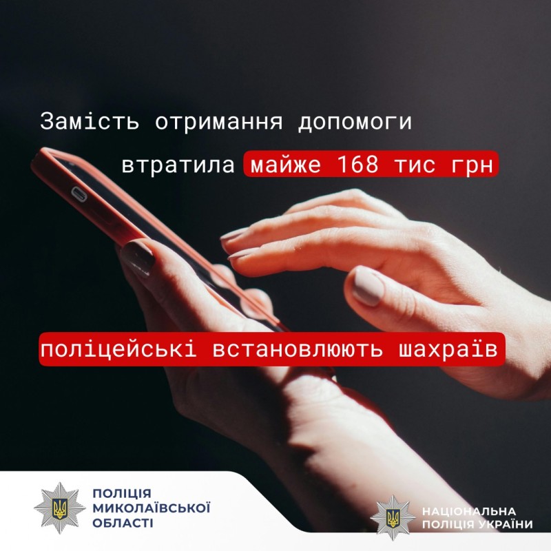 До відділення поліції № 3 Вознесенського райуправління звернулась 52-річна жителька Південноукраїнська та повідомила, що стала жертвою шахраїв. Заявниця втратила майже 168 тисяч гривень з власного банківського рахунку після того, як заповнила на одному з інтернет-ресурсів всі необхідні дані для отримання начебто фінансової допомоги. За вказаним фактом слідчі поліції відкрили кримінальне провадження за ч. 4 ст. 190 Кримінального кодексу України «Шахрайство». Санкція статті передбачає до восьми років позбавлення волі.