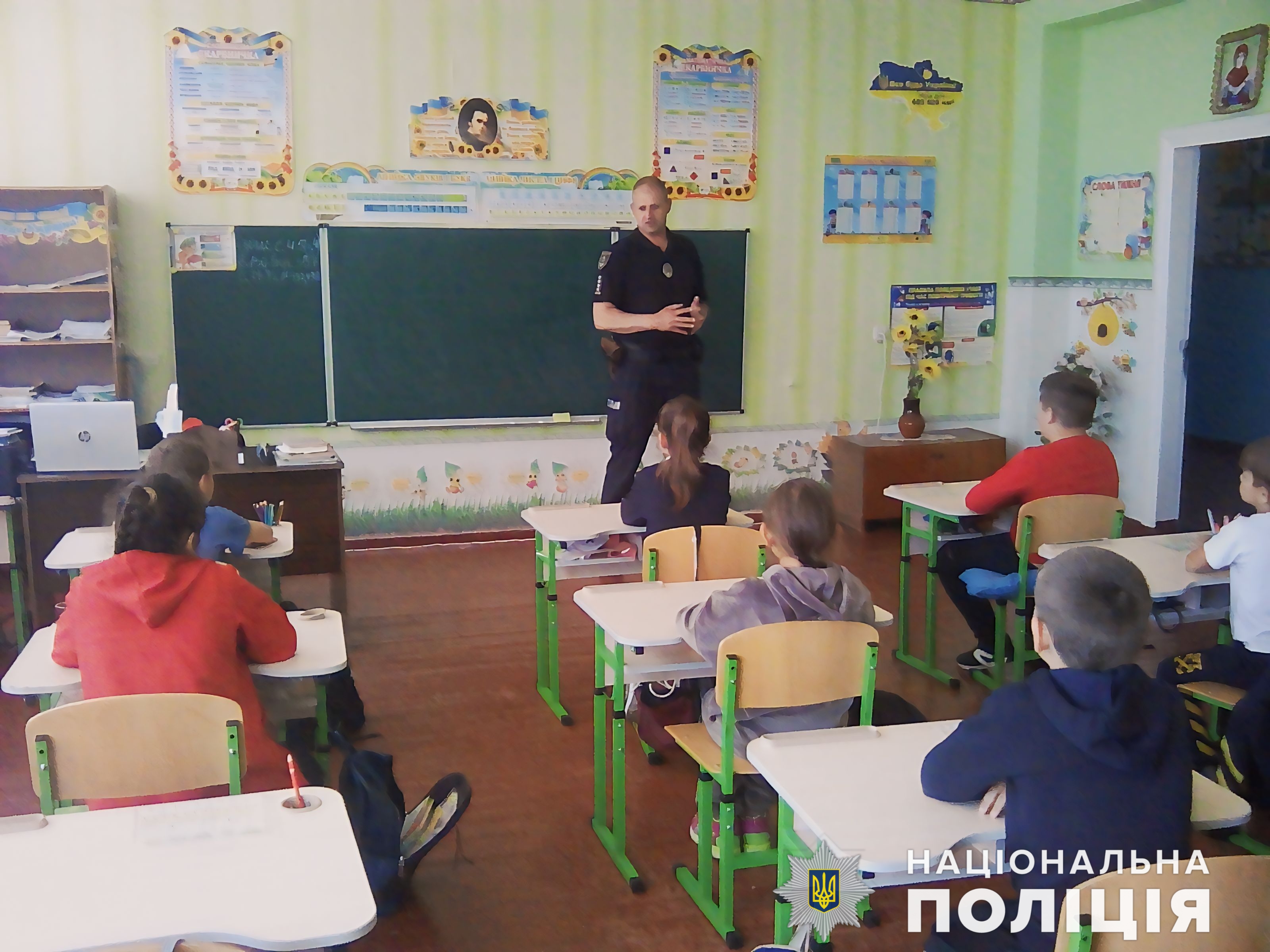 Також правоохоронець зауважив на дотриманні правил мінної безпеки та розповів алгоритм дій при виявленні підозрілих або вибухонебезпечних предметів. Поліцейський зауважив, що до таких об’єктів у жодному разі не можна наближатися, пересувати, а тим паче брати їх до рук. У випадку виявлення небезпечних предметів негайно відійти подалі від знахідки та повідомити дорослих або зателефонувати до поліції за номером 102 чи рятувальникам - 101. Також Олег Бондар нагадав учням, як діяти під час повітряної тривоги та роз’яснив, чому не можна нехтувати заходами особистої безпеки.