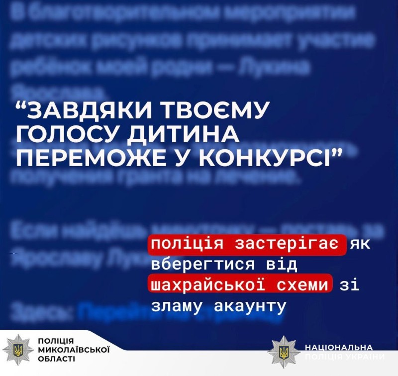 Шахраї продовжують зламувати облікові записи громадян - користувачів месенджерів та у подальшому розсилають їхнім контактам повідомлення із проханням проголосувати за дитину у конкурсі, спортивних змаганнях чи благодійних заходах тощо.