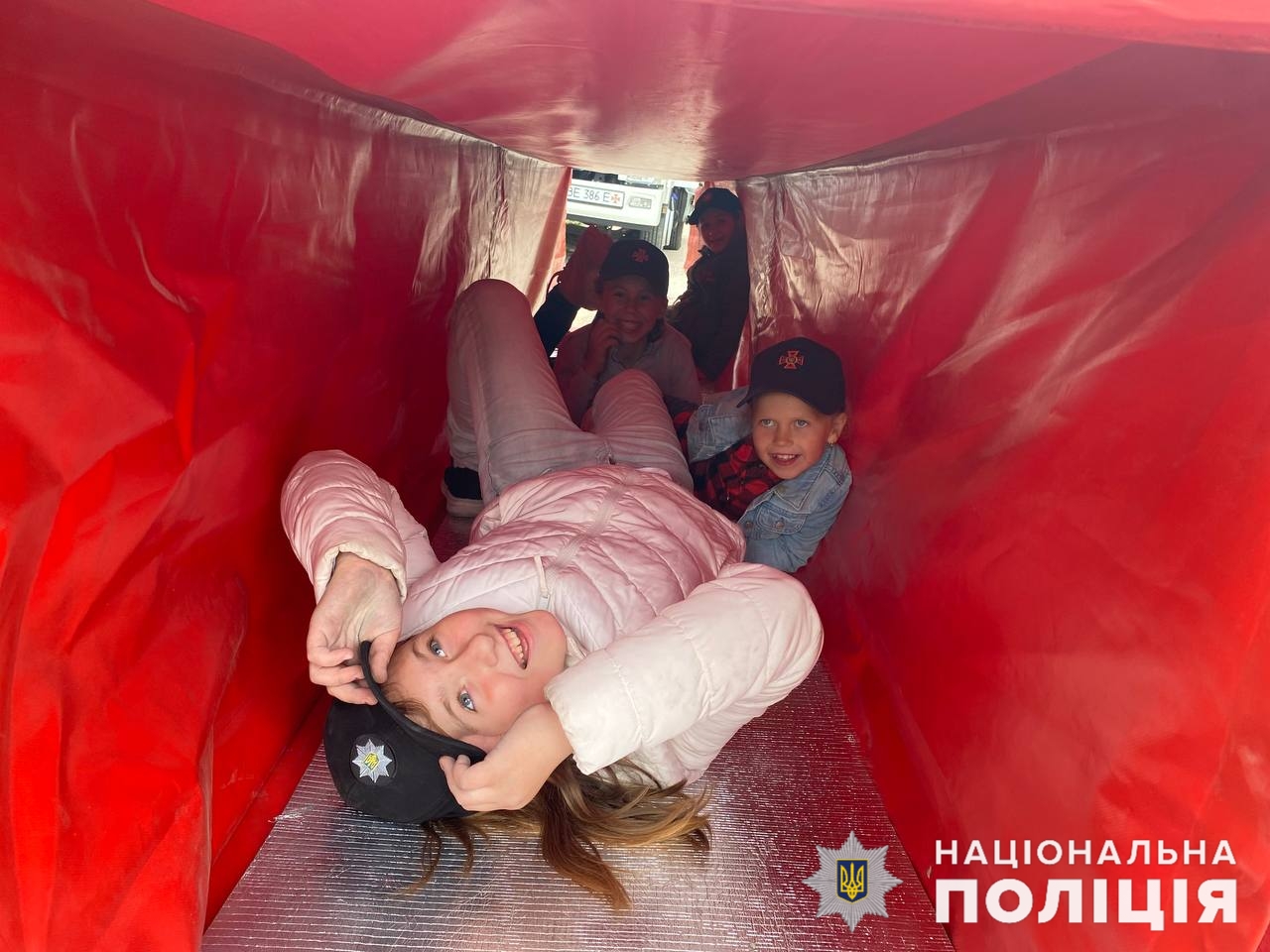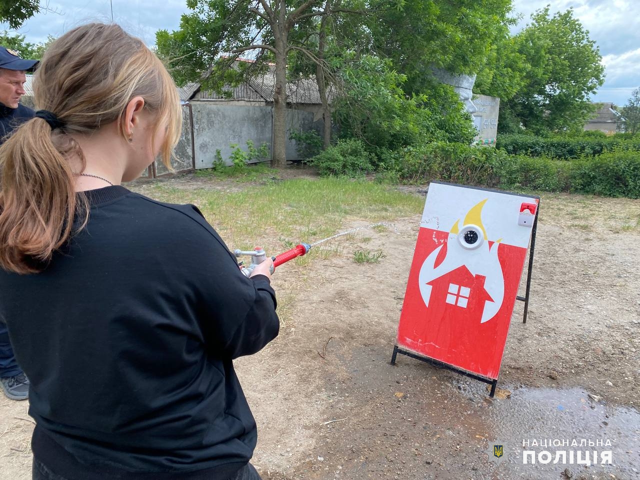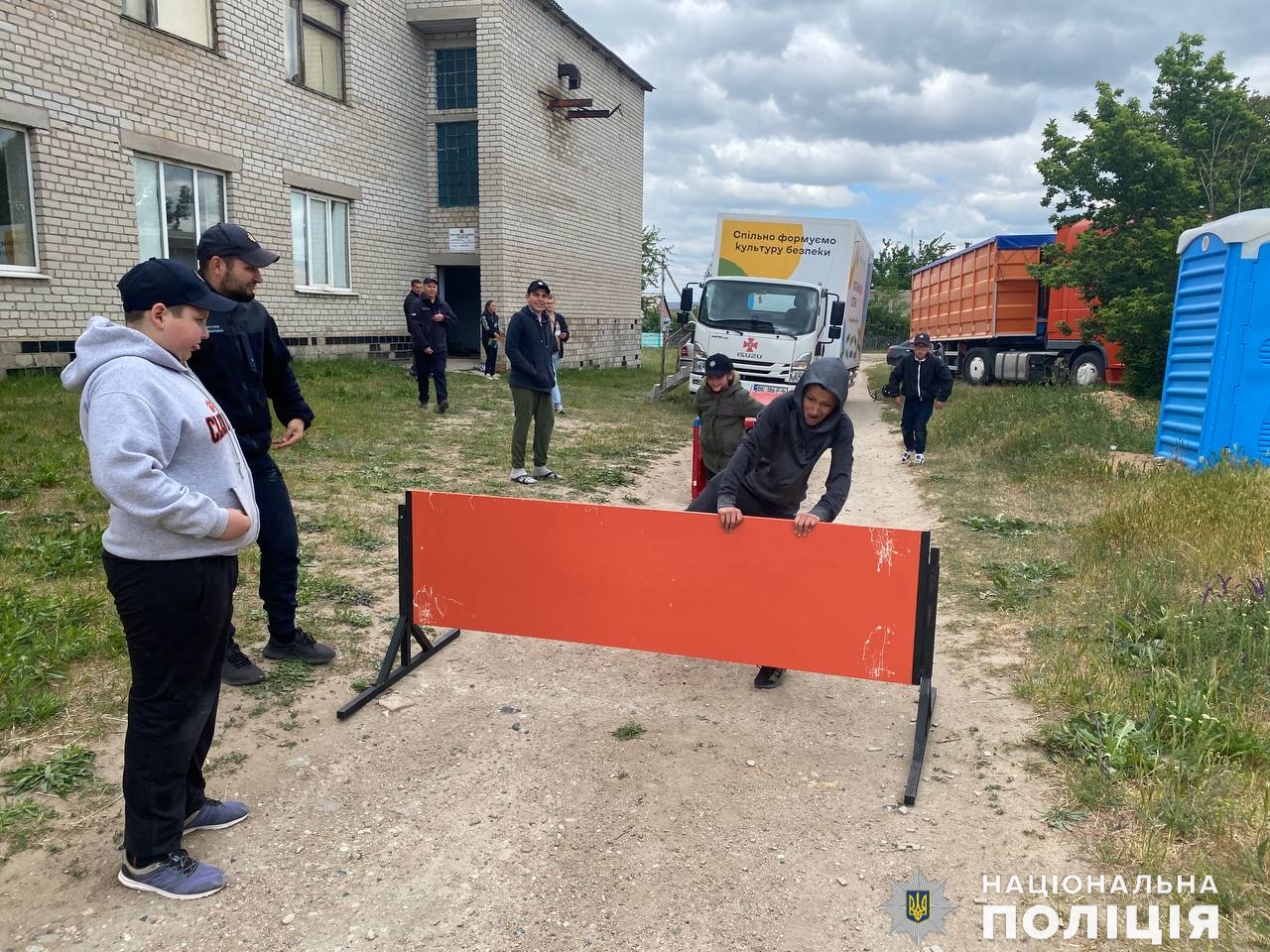 На імпровізованому майданчику діти тренувались гасити умовну пожежу разом із поліцейськими та рятувальниками, а щоб «ліквідувати» надзвичайну подію діти мали пройти спершу «смугу перешкод».