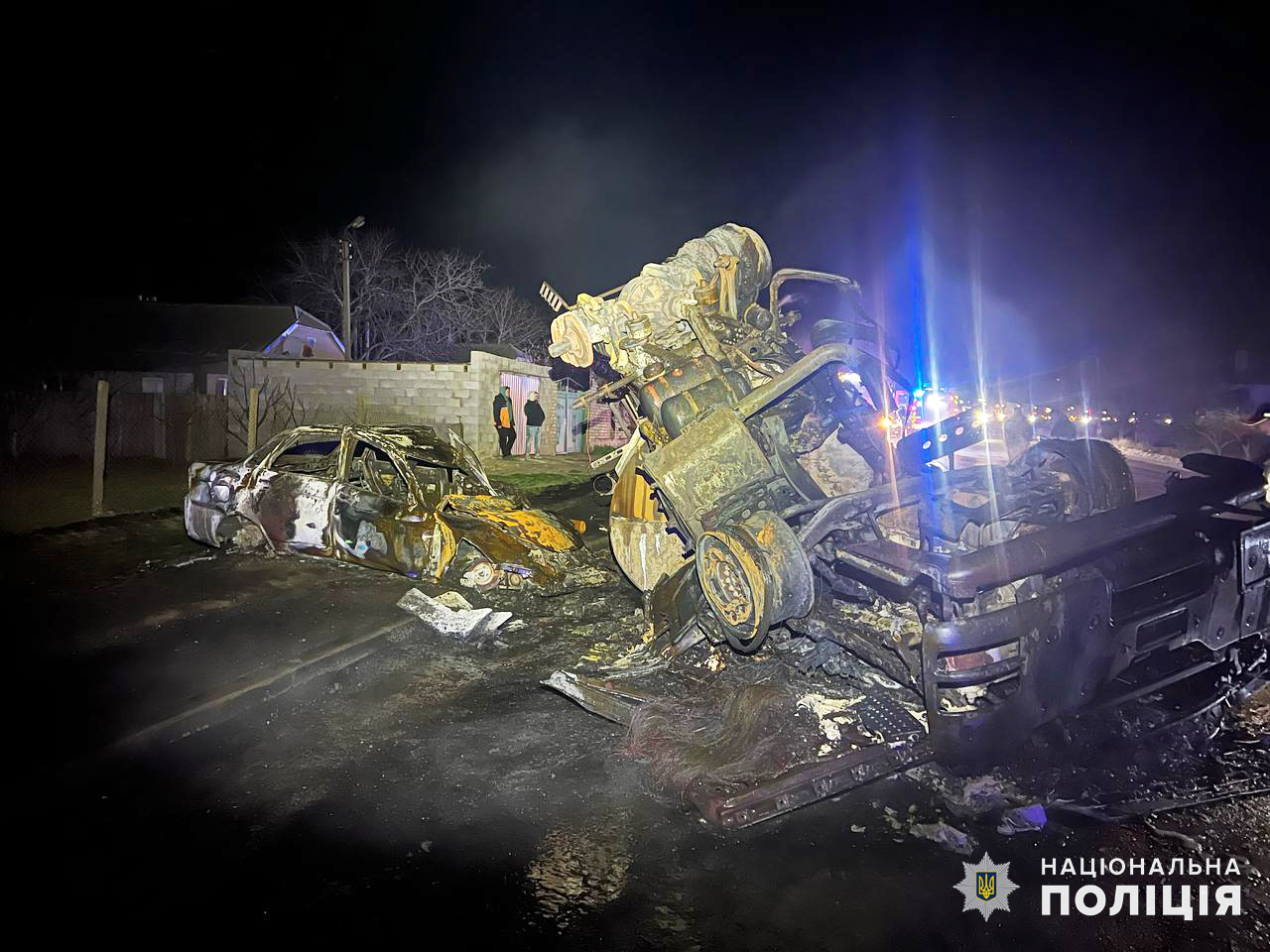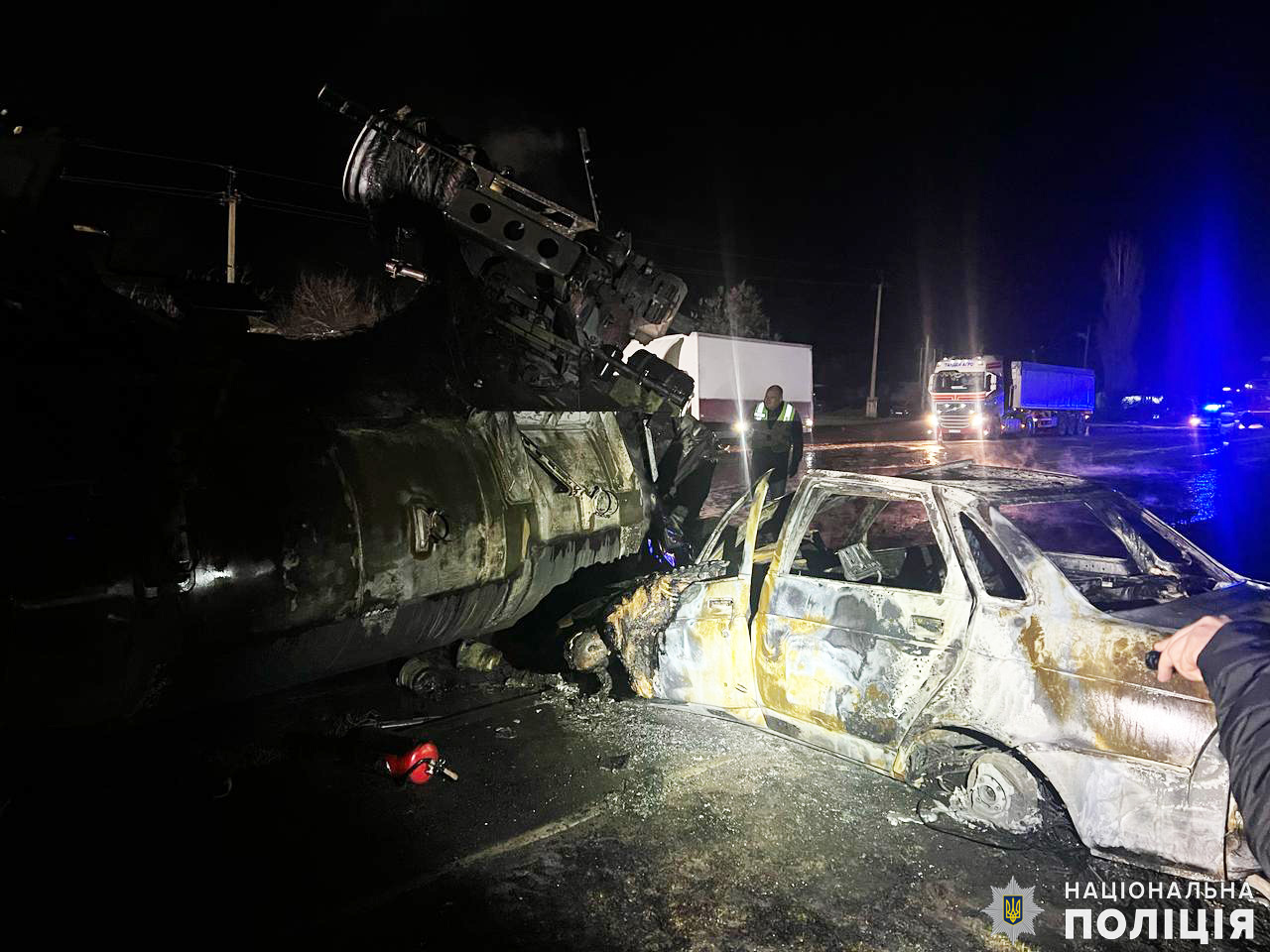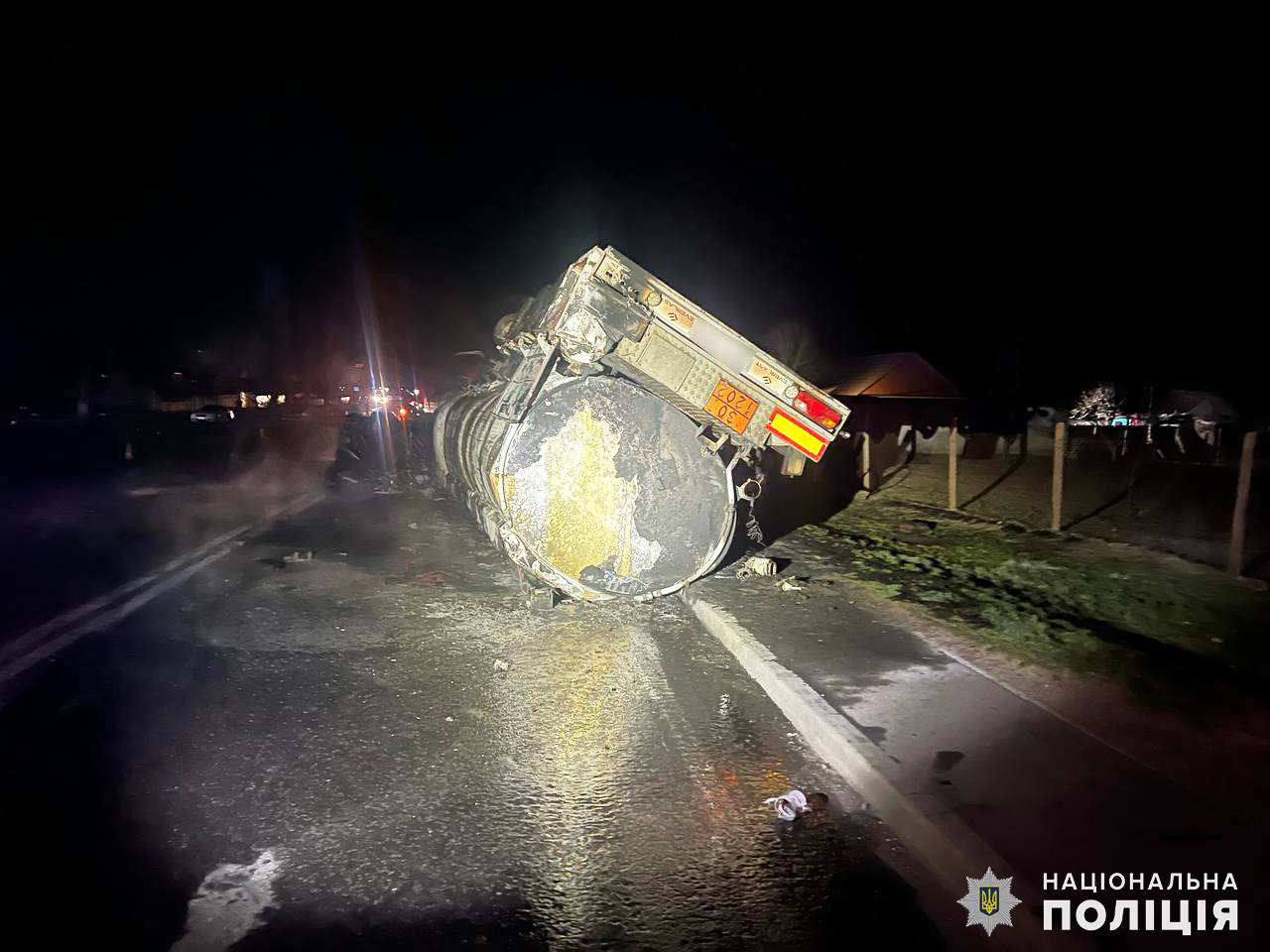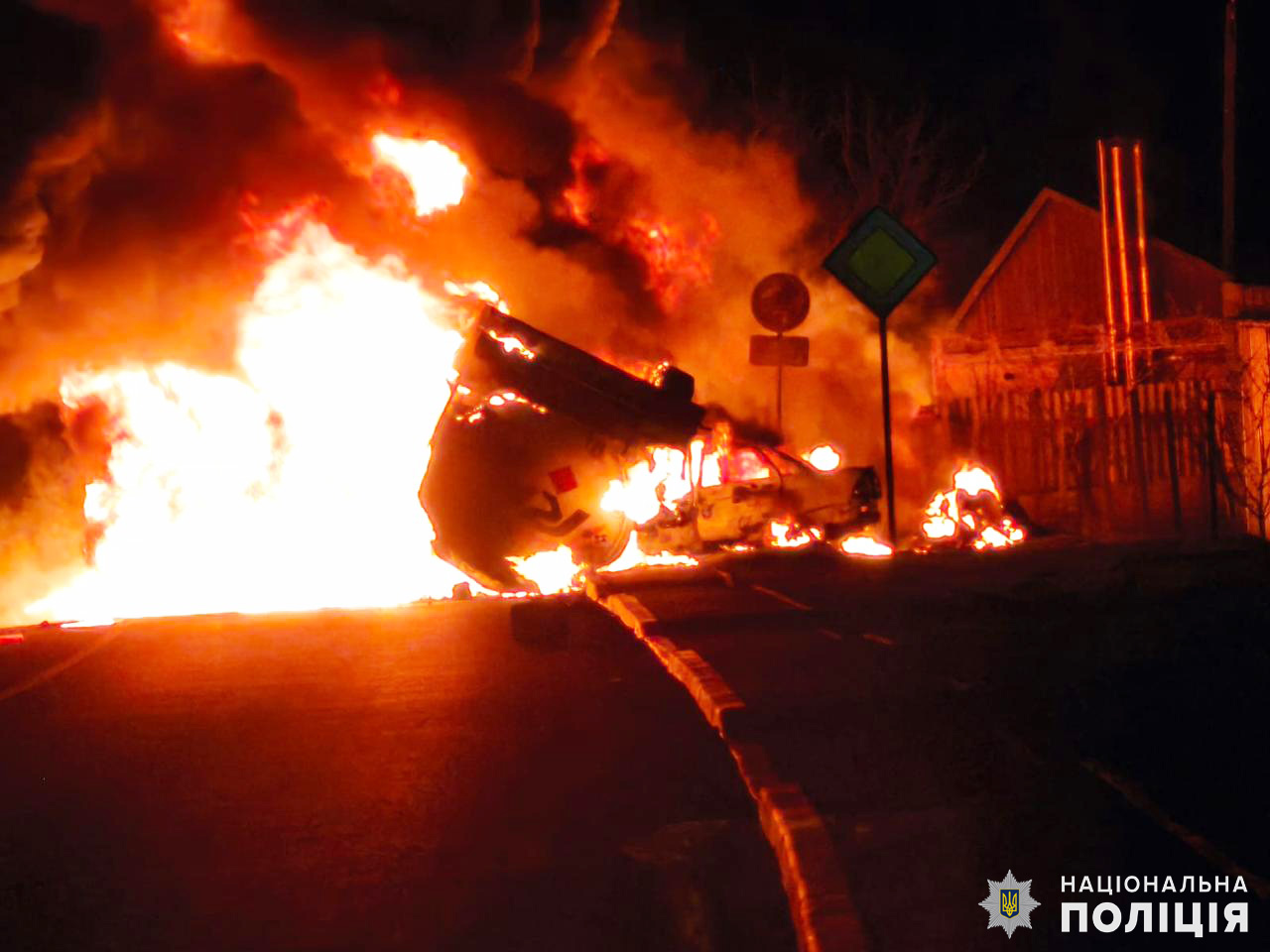 У результаті дорожньо-транспортної пригоди відбулось перекидання вантажівки з цистерною на проїзну частину, внаслідок чого відбувся розлив та займання пального. Полум’ям знищено автомобілі ВАЗ-2170 та MAN. Також пошкоджена приватна господарча споруда. Над ліквідацією наслідків працювали рятувальники ДСНС.