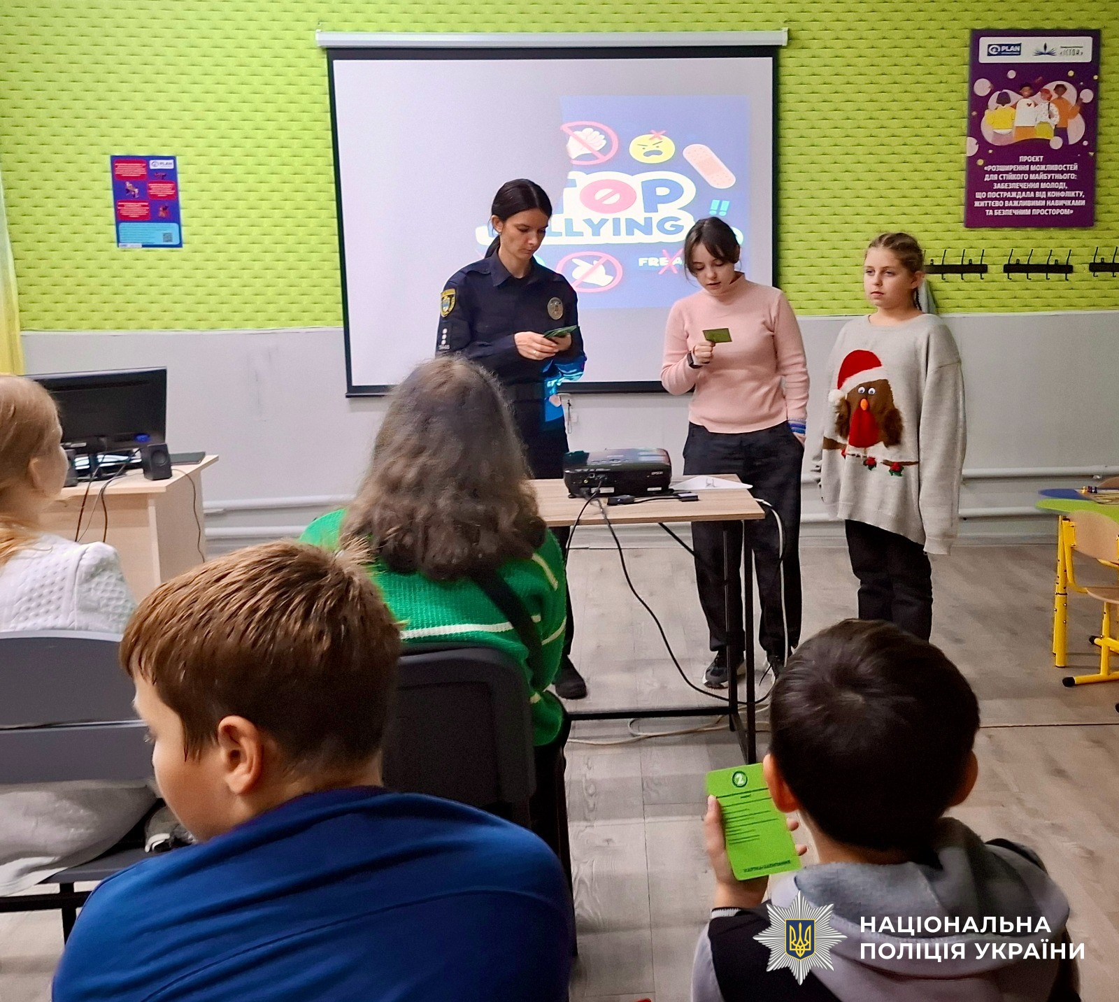 На прикладі навчального відео поліцейські пояснили дітям чим булінг відрізняється від звичайного конфлікту, його різновиди, наслідки і відповідальність. Зазначили, що у ситуації булінгу завжди беруть участь три сторони: той, хто переслідує, той, кого переслідують та ті, хто спостерігають. Наголосили, що обов’язково слід знати та куди звертатись по допомогу: